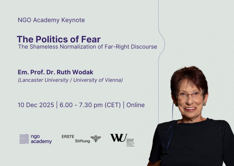 Join us on Dec 10 for the NGO Academy Keynote on “The Politics of Fear”, where Em. Prof. Dr. Ruth Wodak will explore the phenomenon of “shameless normalization”: a process through which provocation, denial, and conspiracy theories are not just tolerated but strategically deployed by political actors to shift the limits of the sayable.